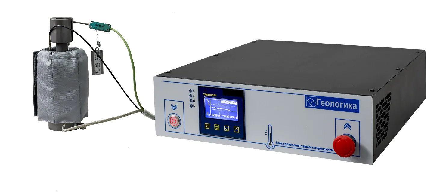 The thermostatic control unit is designed to control heating elements operating as part of laboratory or other equipment. The unit can be connected to a personal computer. Specialized software is provided to control the heating process and collect/process data from temperature sensors (logging data to files, displaying current data as parameter-time graphs, and controlling heating according to a set program).